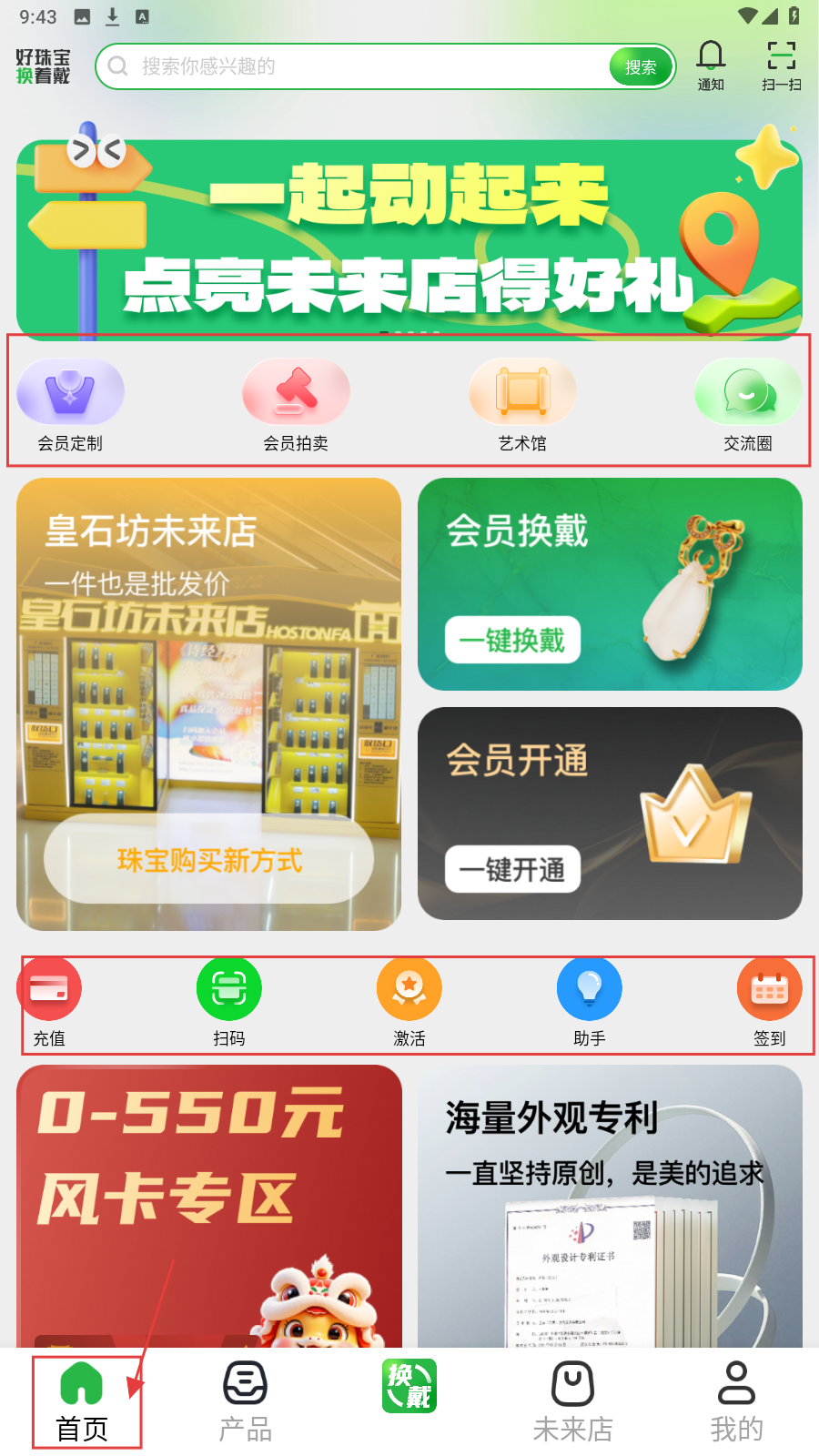 1、在APP【首页】,可使用【会员定制】【会员拍卖】等功能,也能进行【充值】【扫码】等操作,浏览活动及商品专区。