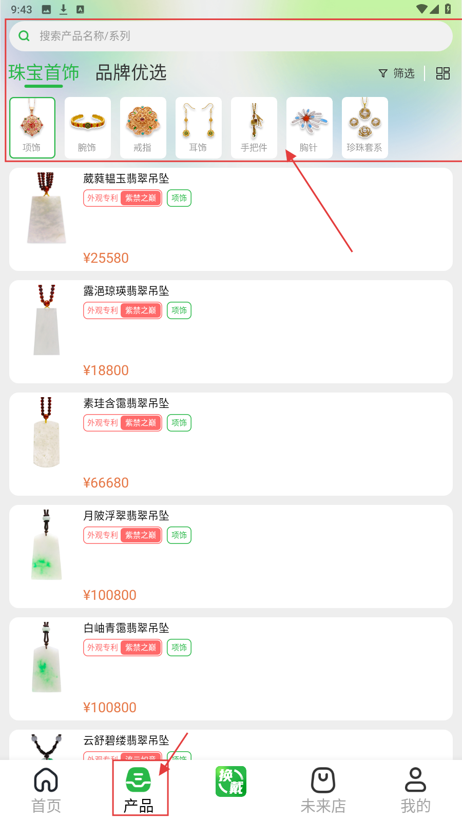 2、点击底部【产品】,进入产品页,按【项饰】【腕饰】等分类浏览珠宝首饰,查看“葳蕤韫玉翡翠吊坠”等商品详情、价格。