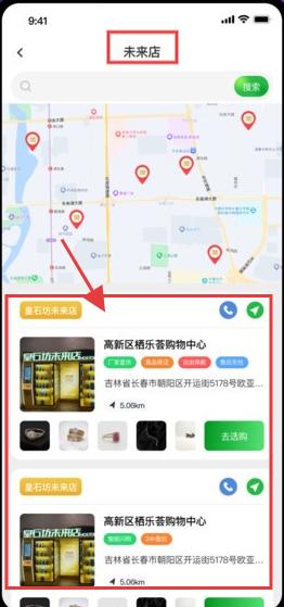 3、切换到【未来店】页,可查看“皇石坊未来店”等门店位置,获取地址、距离等信息,点击【去选购】前往门店。