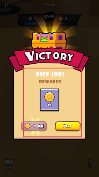 3、胜利后留意奖励界面,及时领取金币等奖励,按需选择是否使用奖励翻倍功能,点击“NEXT”进入下一阶段。