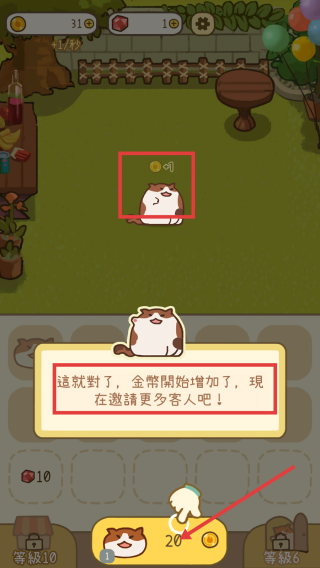 2、关注游戏界面中金币的增长情况,如提示“金幣開始增加了”,如底部显示数字金币图标的按钮,来邀请更多客人,获取更多金币收益。