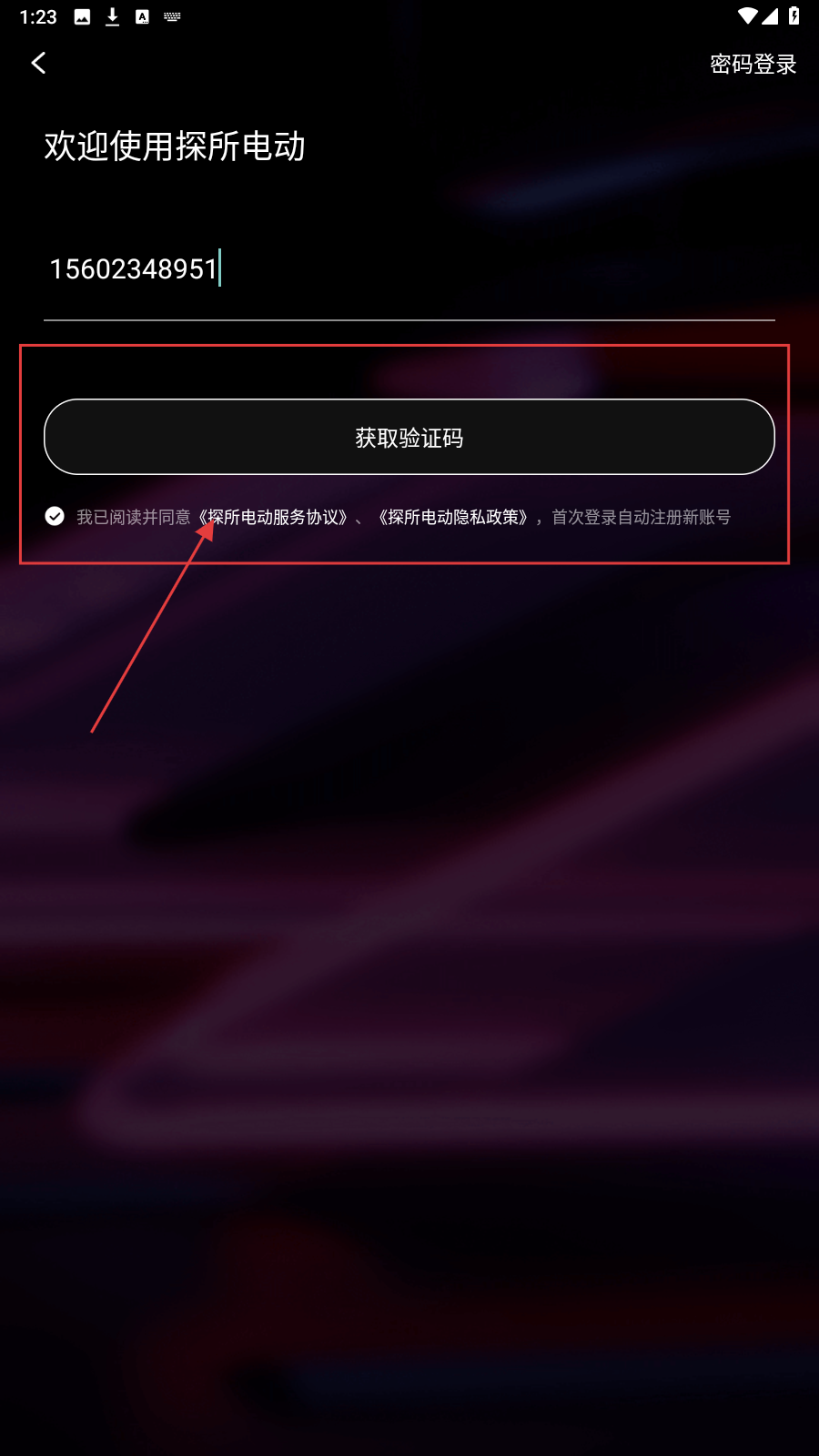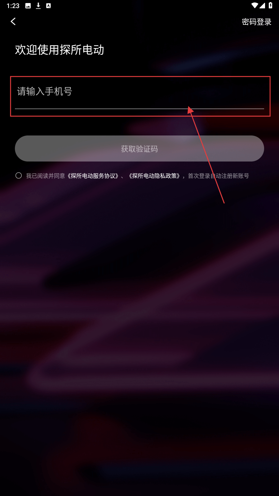 1、打开探所电动APP登录页,在“请输入手机号”框填入号码。