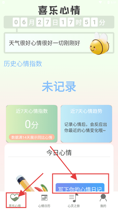 1、进入“喜乐多多”APP首页,点击底部【写下你的心情日记】,进入今日心情记录页。