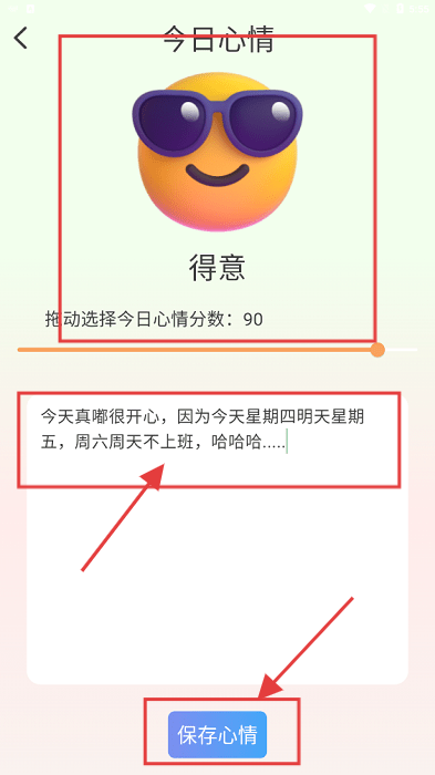 2、在今日心情页,选心情表情(如得意)、拖选心情分数(如90),输入心情文字,点击【保存心情】。