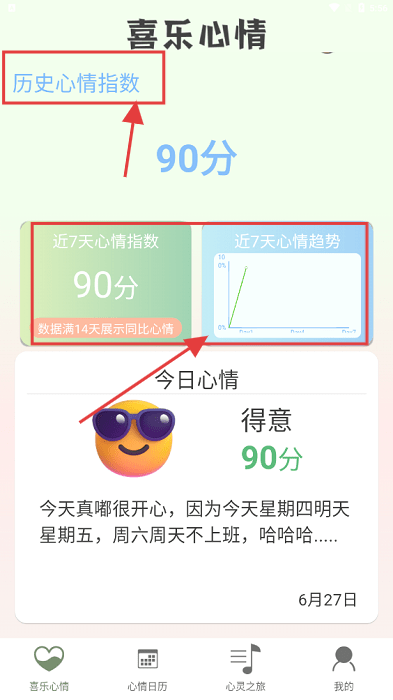 3、返回首页,可在“历史心情指数”查看记录、近7天指数/趋势,完成心情记录与查看流程。