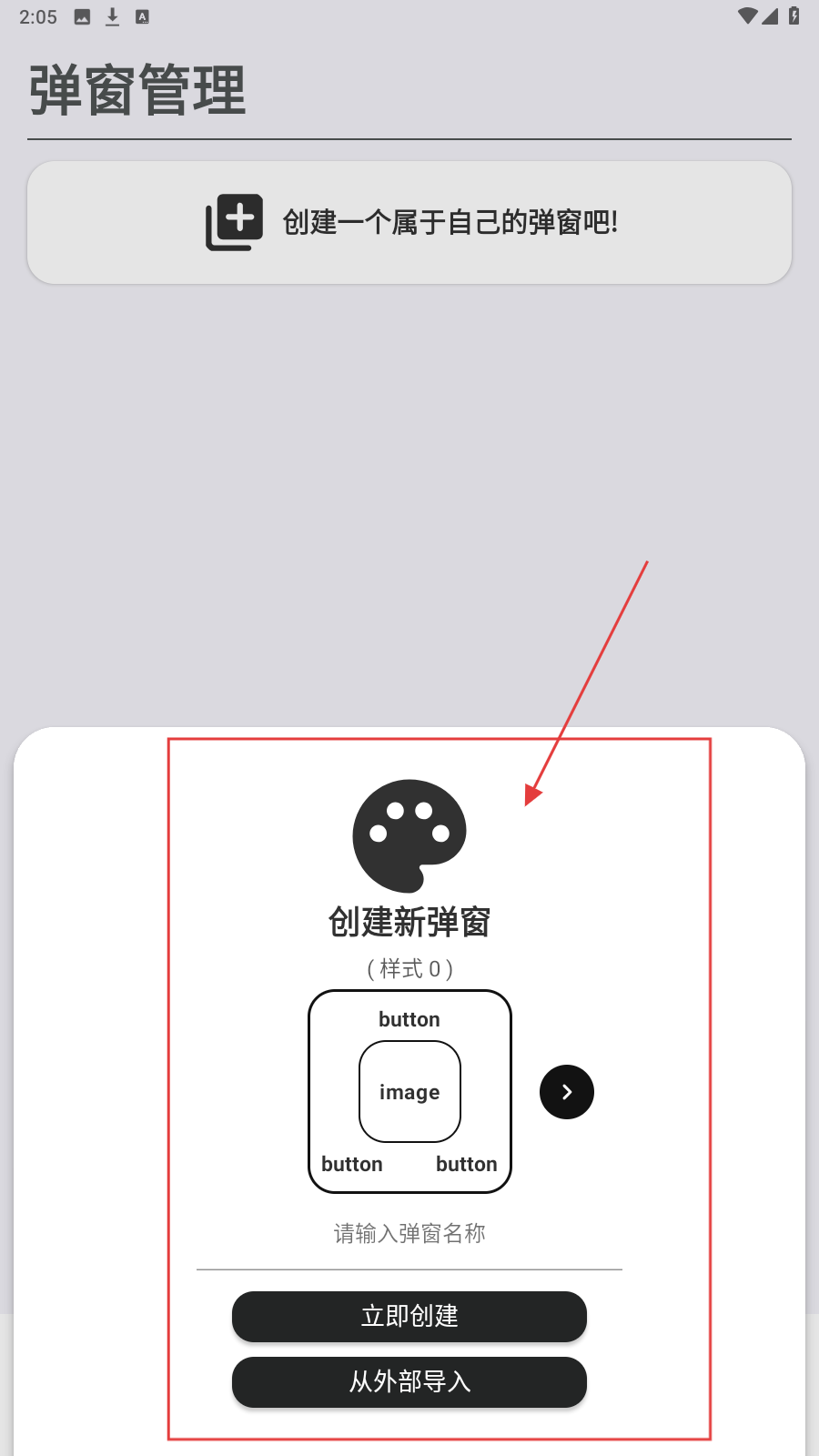 2、在弹窗管理页,点【创建新弹窗】,输入名称后选【立即创建】或【从外部导入】。