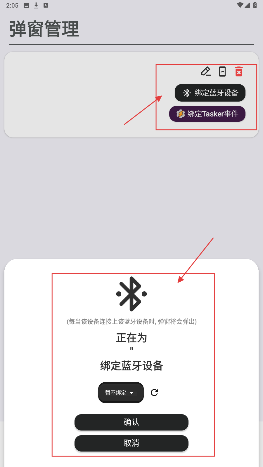 3、创建后,可操作【绑定蓝牙设备】【绑定Tasker事件】,按提示完成绑定(如选蓝牙设备、确认绑定),实现弹窗与设备/事件关联。