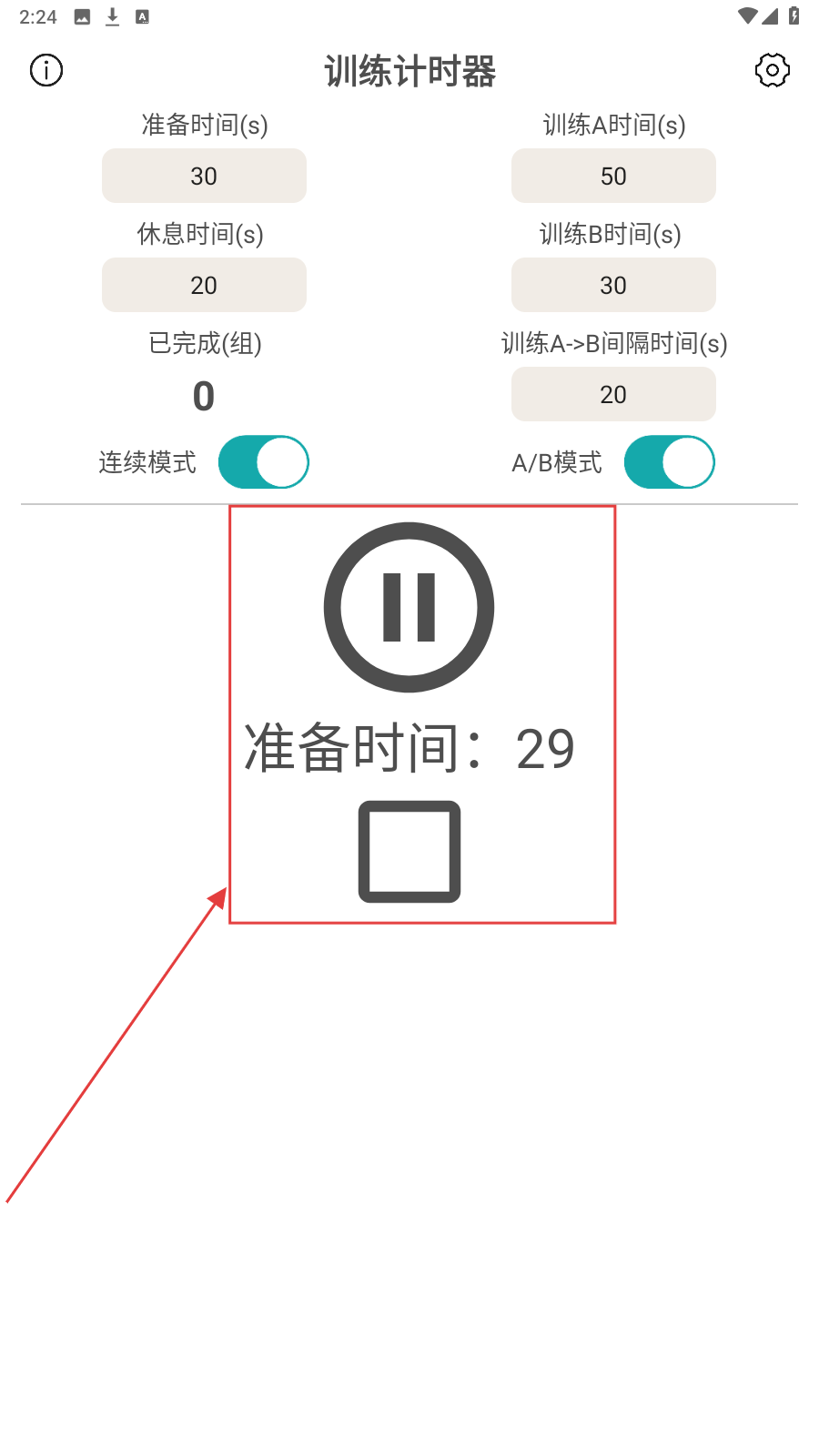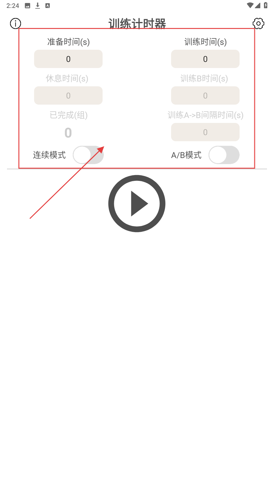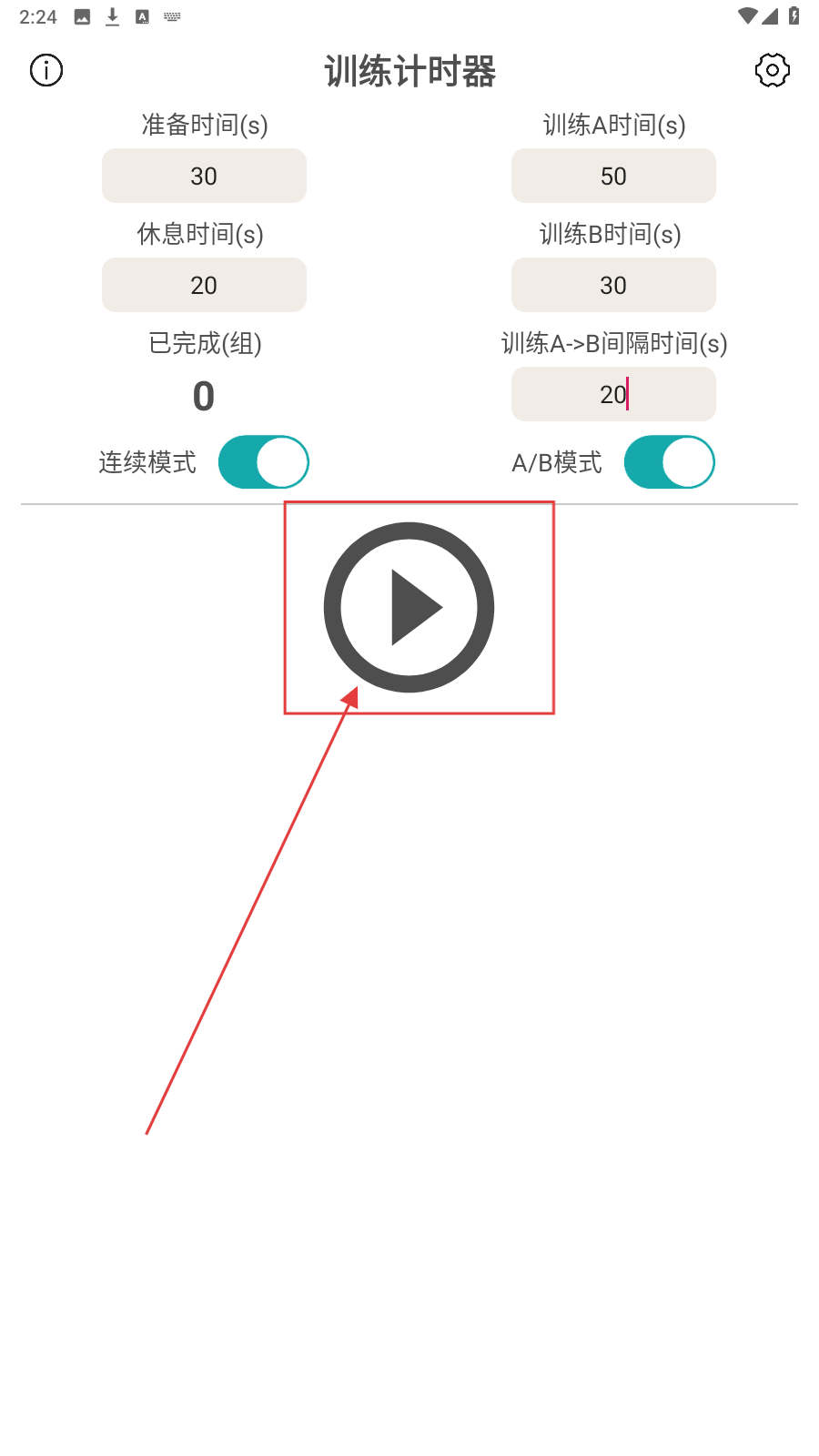 1、进入训练计时器APP,设置【准备时间】【休息时间】等参数,按需开启【连续模式】【A/B模式】。
