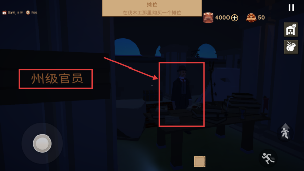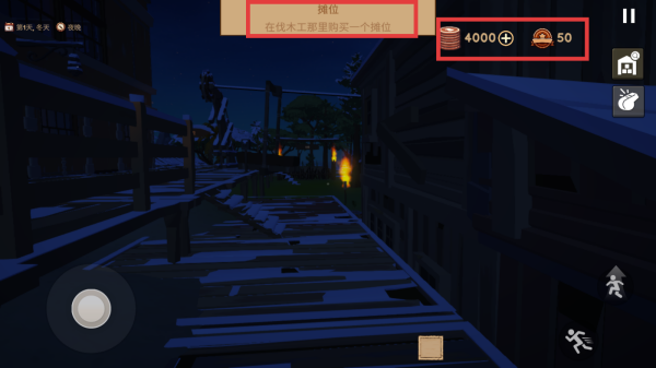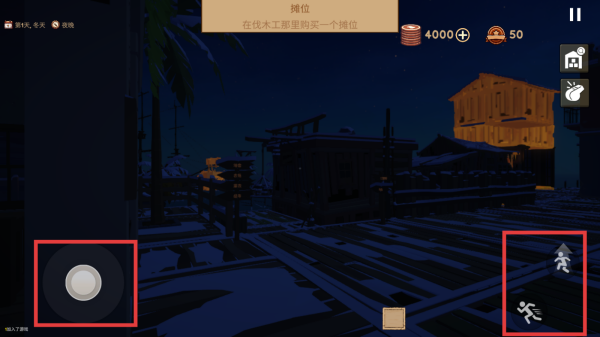 2、留意右上角货币数量(4000金币、50其他货币),按提示在伐木工处花费金币购买【摊位】,开启经营玩法。