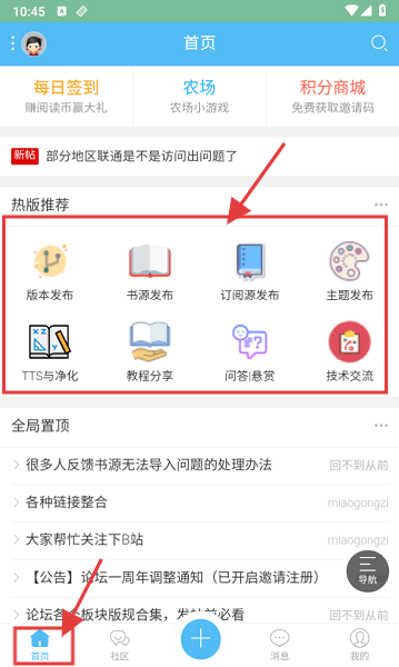 1、进入APP【首页】,可见【每日签到】【农场】等入口,及【版本发布】等“热版推荐”工具、【全局置顶】内容(如书源导入问题办法)。