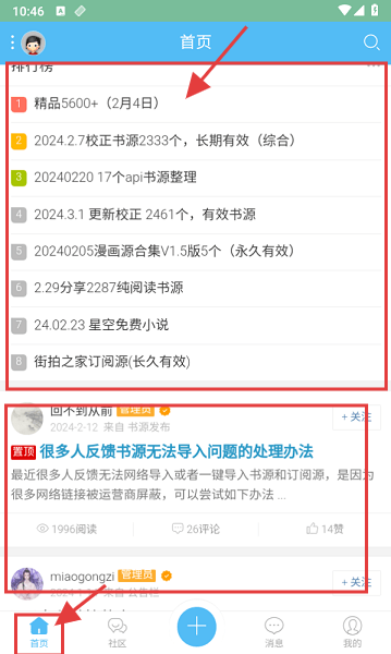 2、在【首页】往下滑动还可浏览新帖(如“精品5600+”)、置顶帖,获取书源、阅读相关信息。