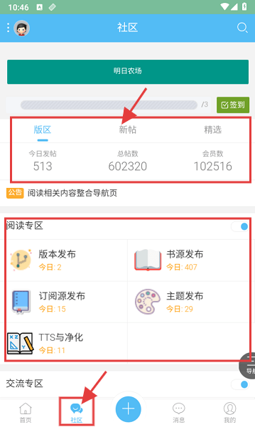 3、切换【社区】页,还能查看“明日农场”签到,及【版块】(今日发帖513、总帖602320等)、【阅读专区】。