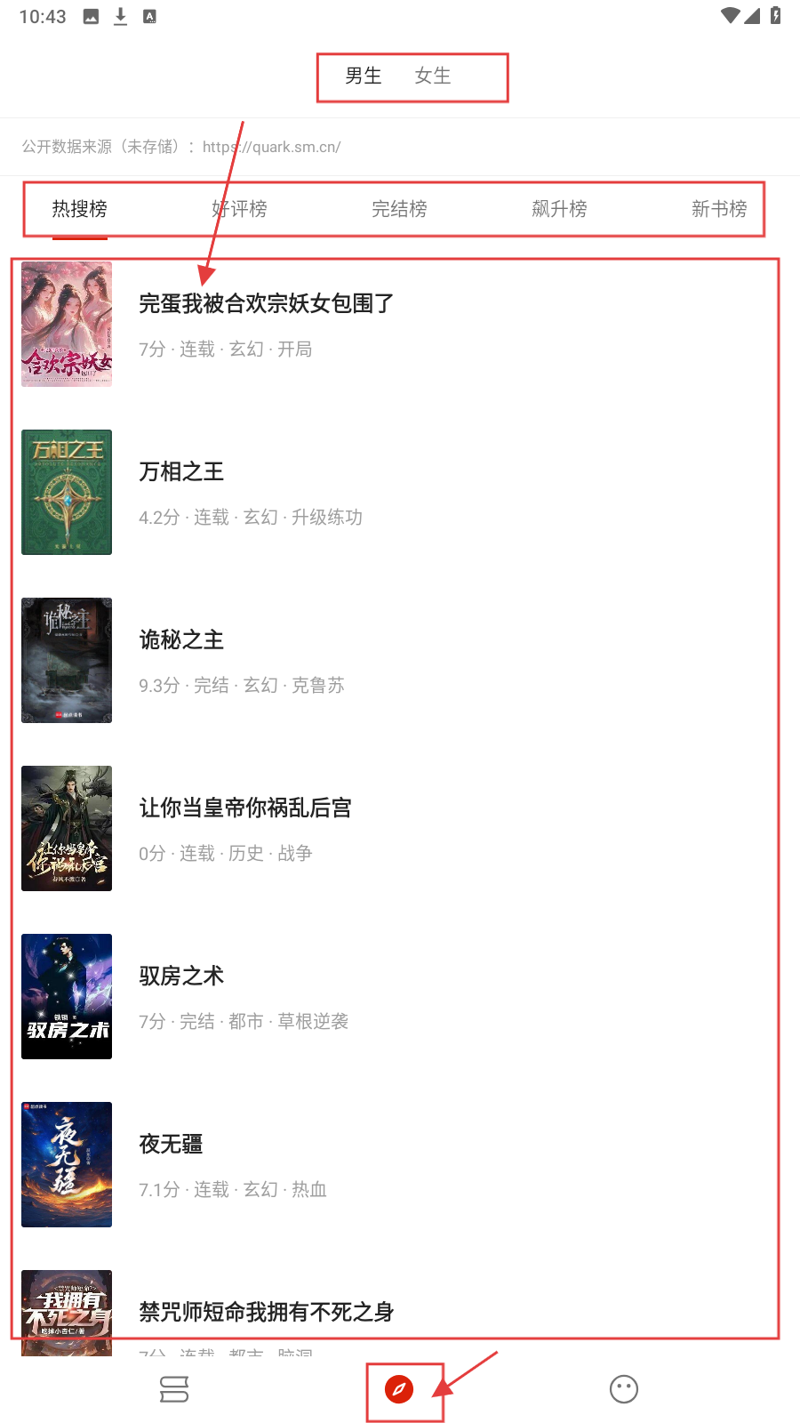 1、进入APP,选【男生】或【女生】频道,通过热搜/好评等榜单(如热搜榜)找小说。