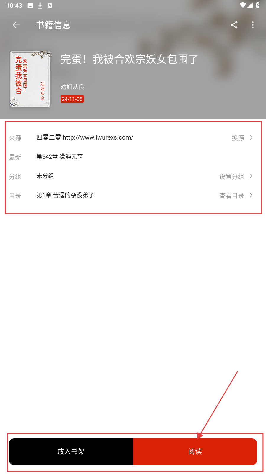 3、进入书籍信息页,可看来源、章节等,点【阅读】开始读,或【放入书架】收藏。