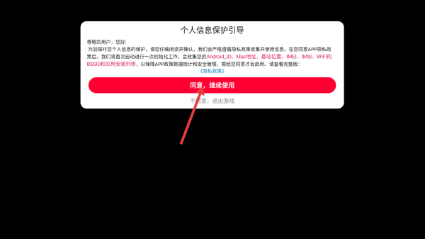 1、进入游戏,点击【同意,继续使用】。