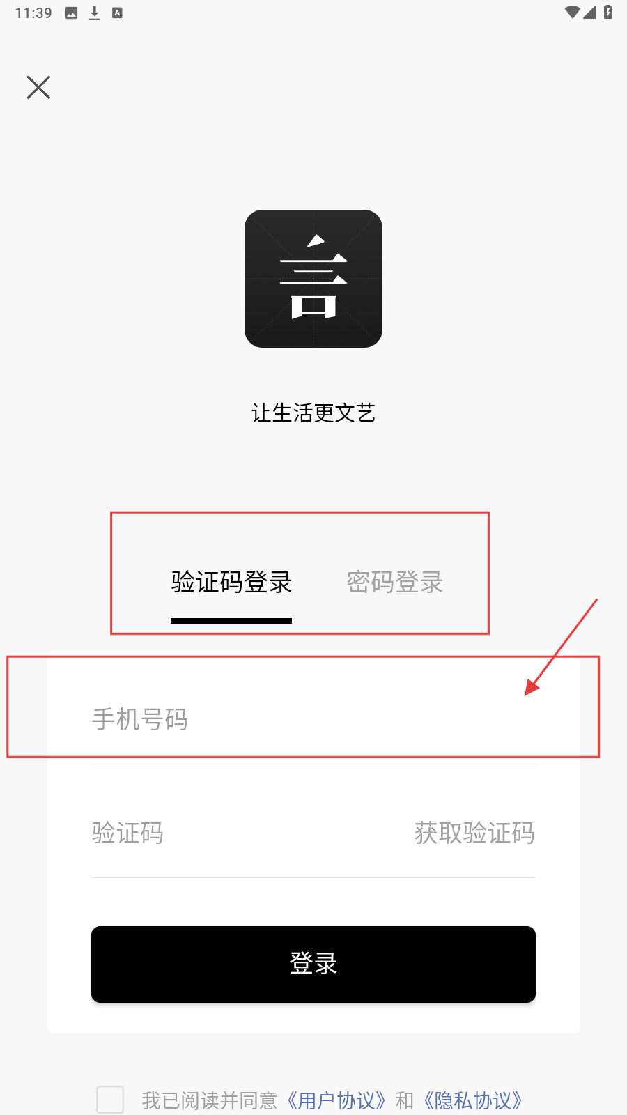 1、进入APP登录页,选【验证码登录】或【密码登录】,输入【手机号码】。