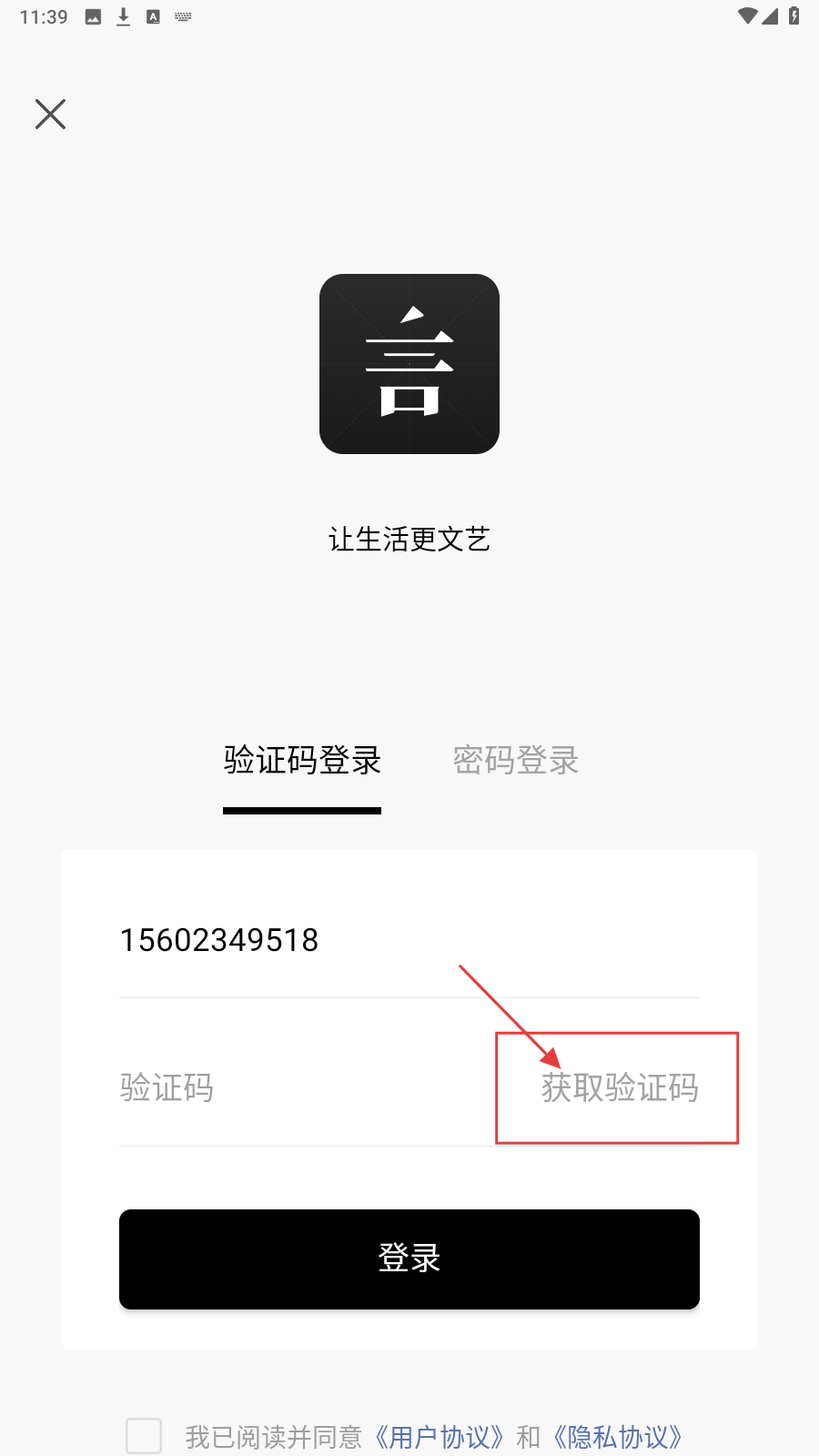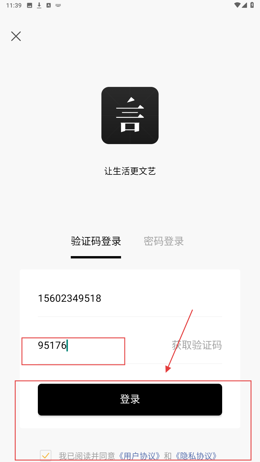 3、输入收到的验证码,勾选同意协议,点【登录】,完成APP登录流程。