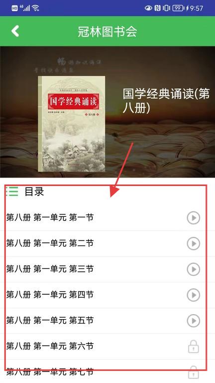 3、点【冠林图书会】,进入《国学经典诵读(第八册)》页,查看目录(第一单元多节内容),点播放按钮听对应章节。