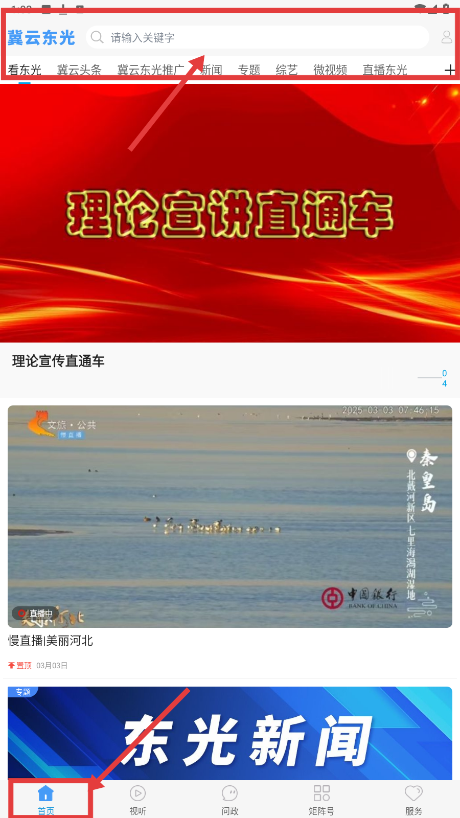 1、进入“冀云东光”APP【首页】,通过顶部搜索栏搜内容,或点【看东光】【冀云头条】等频道(如【理论宣讲直通车】)浏览资讯。