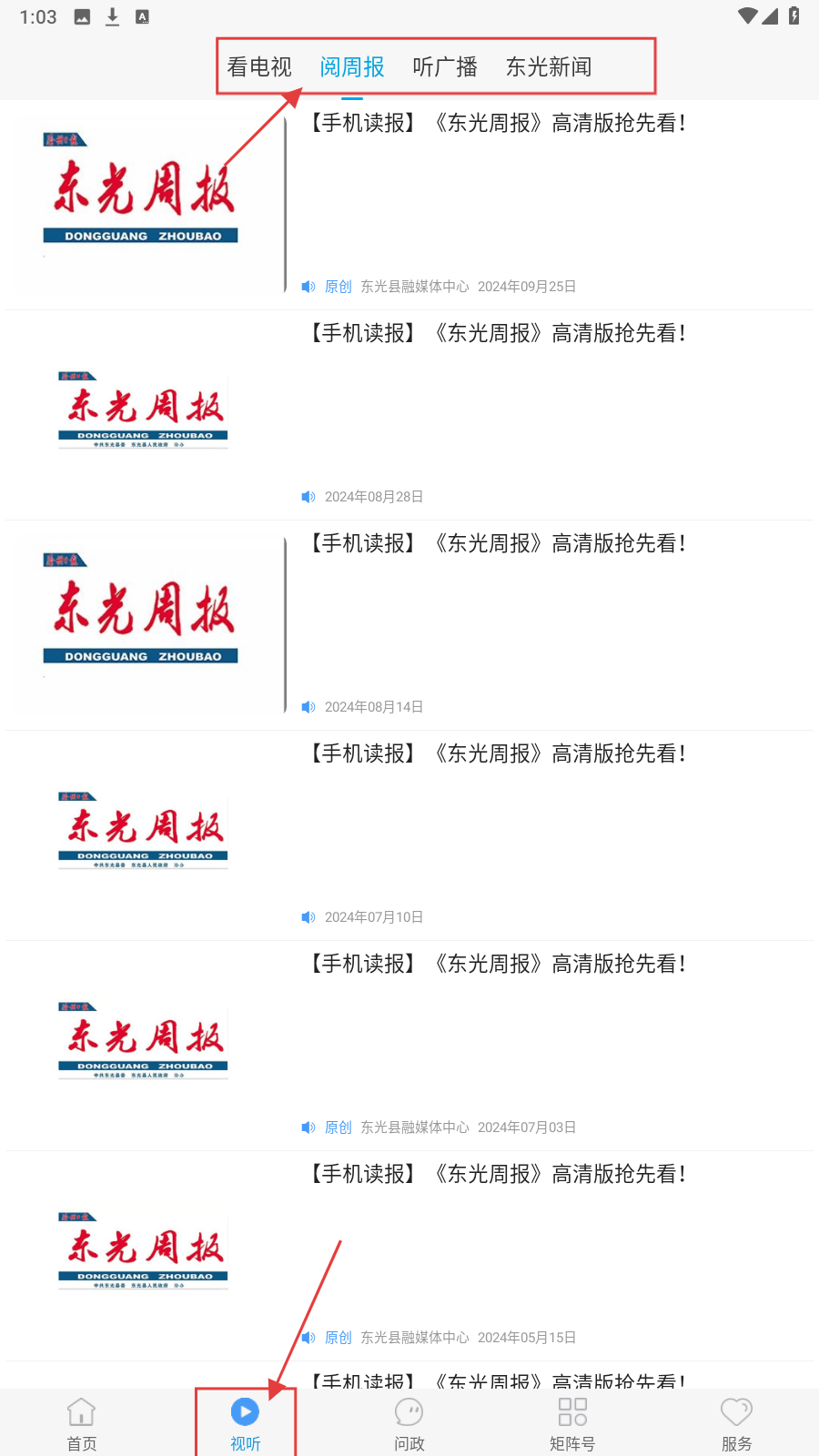 2、切换【视听】页,选【看电视】【阅周报】等分类(如“阅周报”下看《东光周报》),查看对应内容(手机读报、新闻等)。