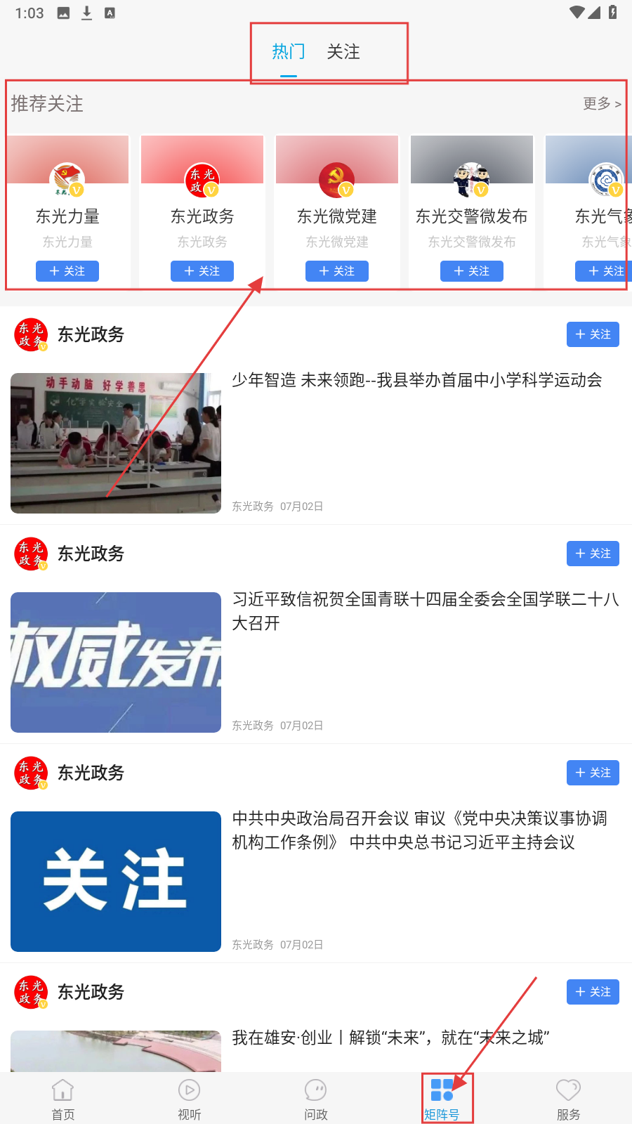 3、点击【矩阵号】页面,可以查看【热门】或者【关注】的公众号发布的文章。