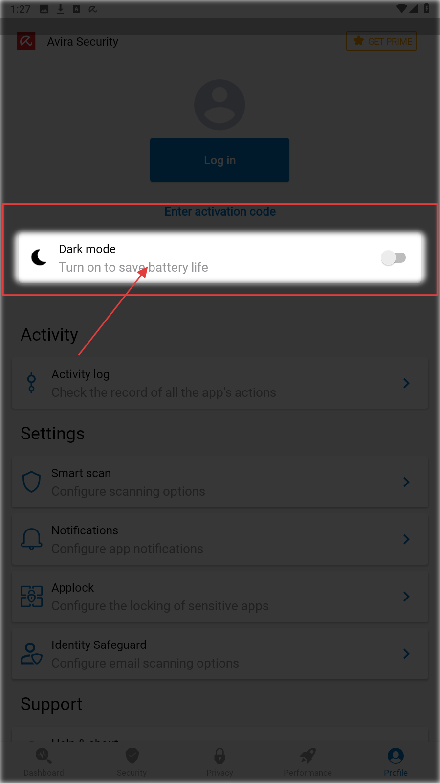 1、在【Profile】页,可设置【Darkmode】(深色模式,开启节省电量),还有登录、激活码输入等功能。