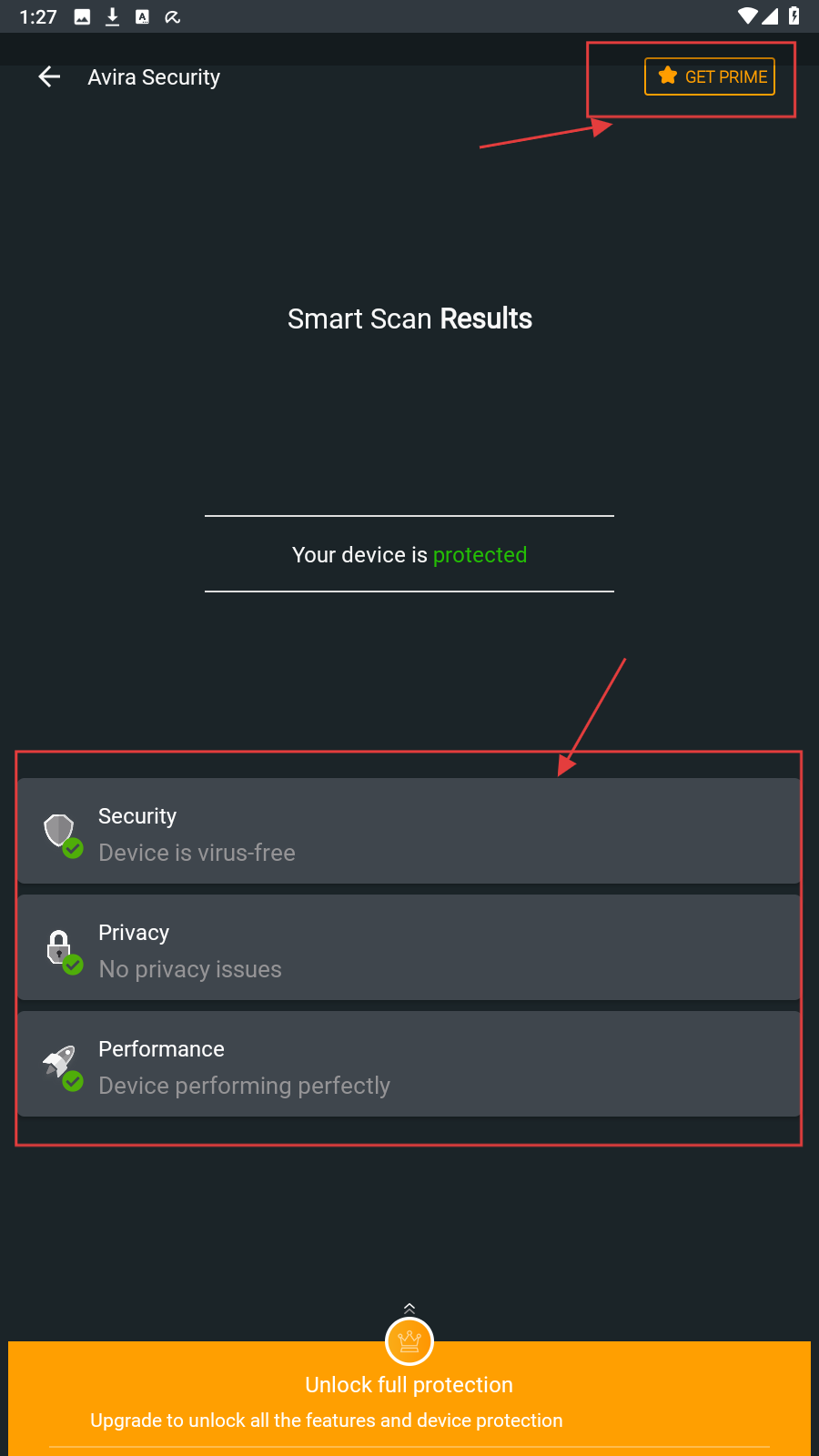 3、扫描后进入【SmartScanResults】页,显示设备安全(无病毒)、隐私(无问题)、性能(表现佳)状态。
