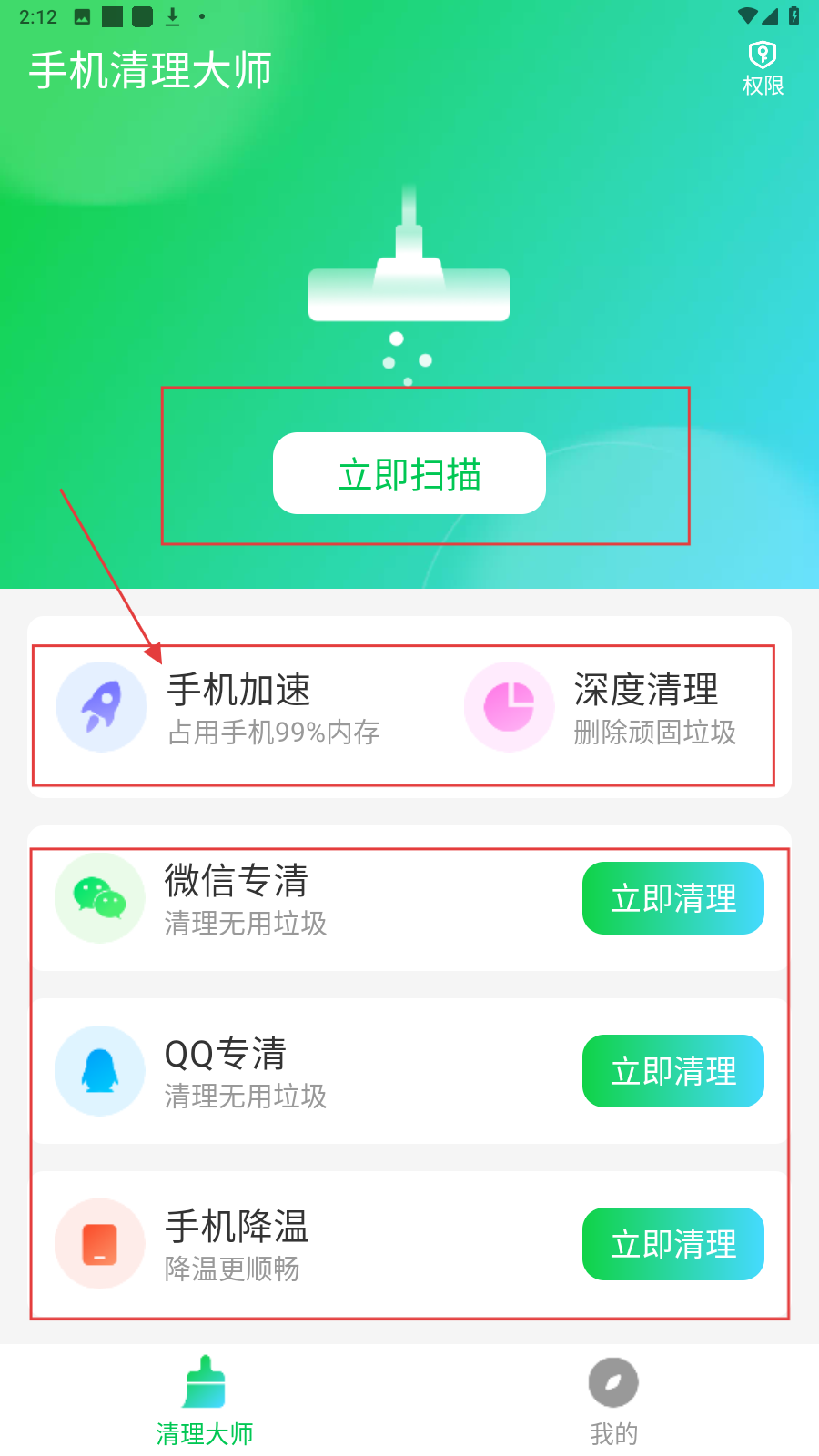 1、打开应用,首页有【立即扫描】按钮,及【手机加速】【深度清理】、微信专清等功能,点击对应功能可使用。