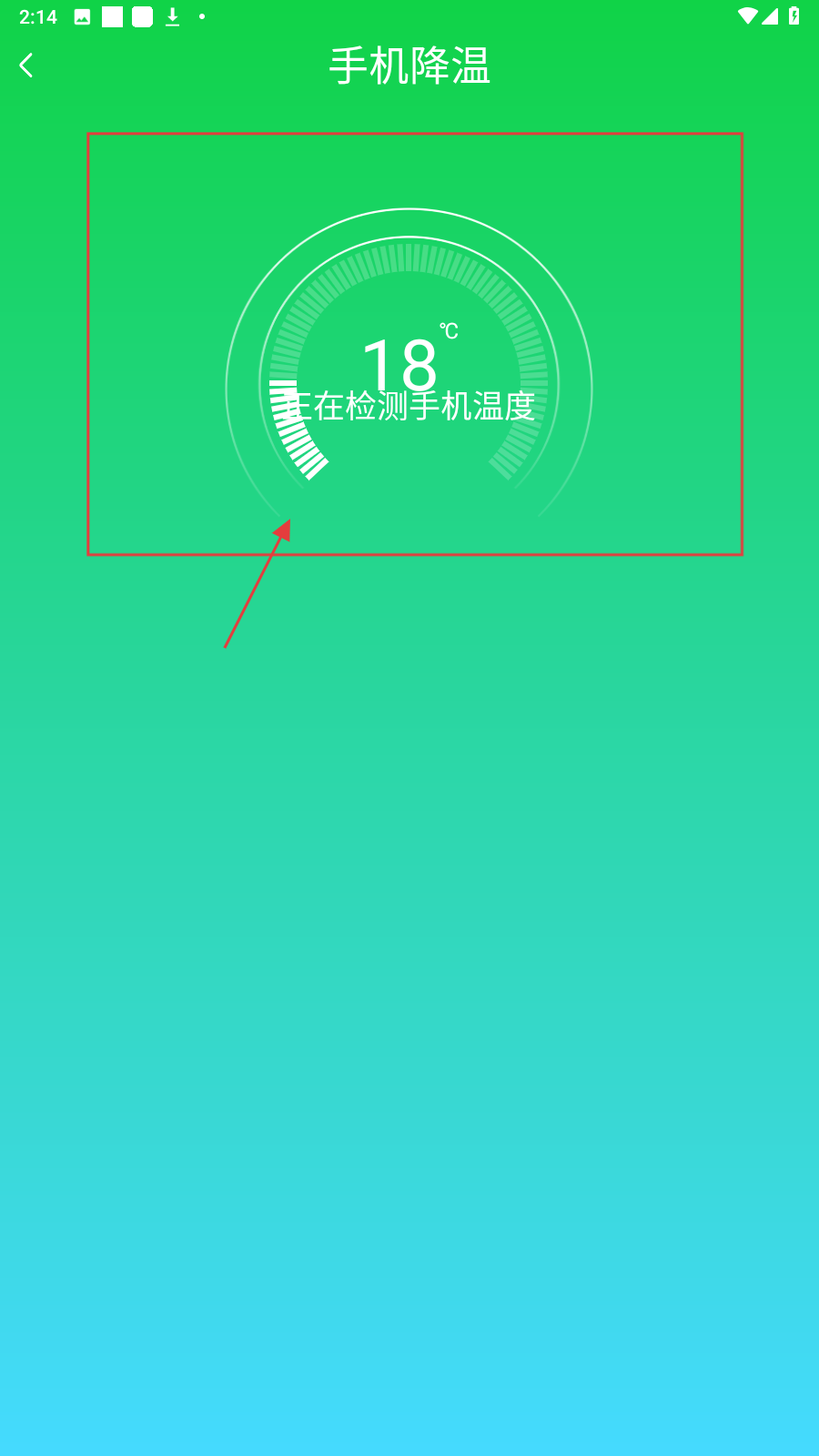 2、进入【手机降温】流程,页面先显示18℃,正在检测手机温度的环形进度样式,等待检测完成。