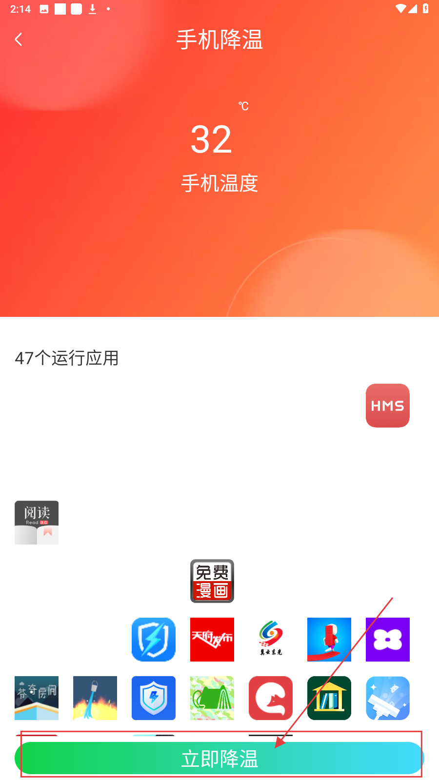 3、检测后显示32℃手机温度、47个运行应用列表,点击【立即降温】执行降温操作,完成手机优化流程。