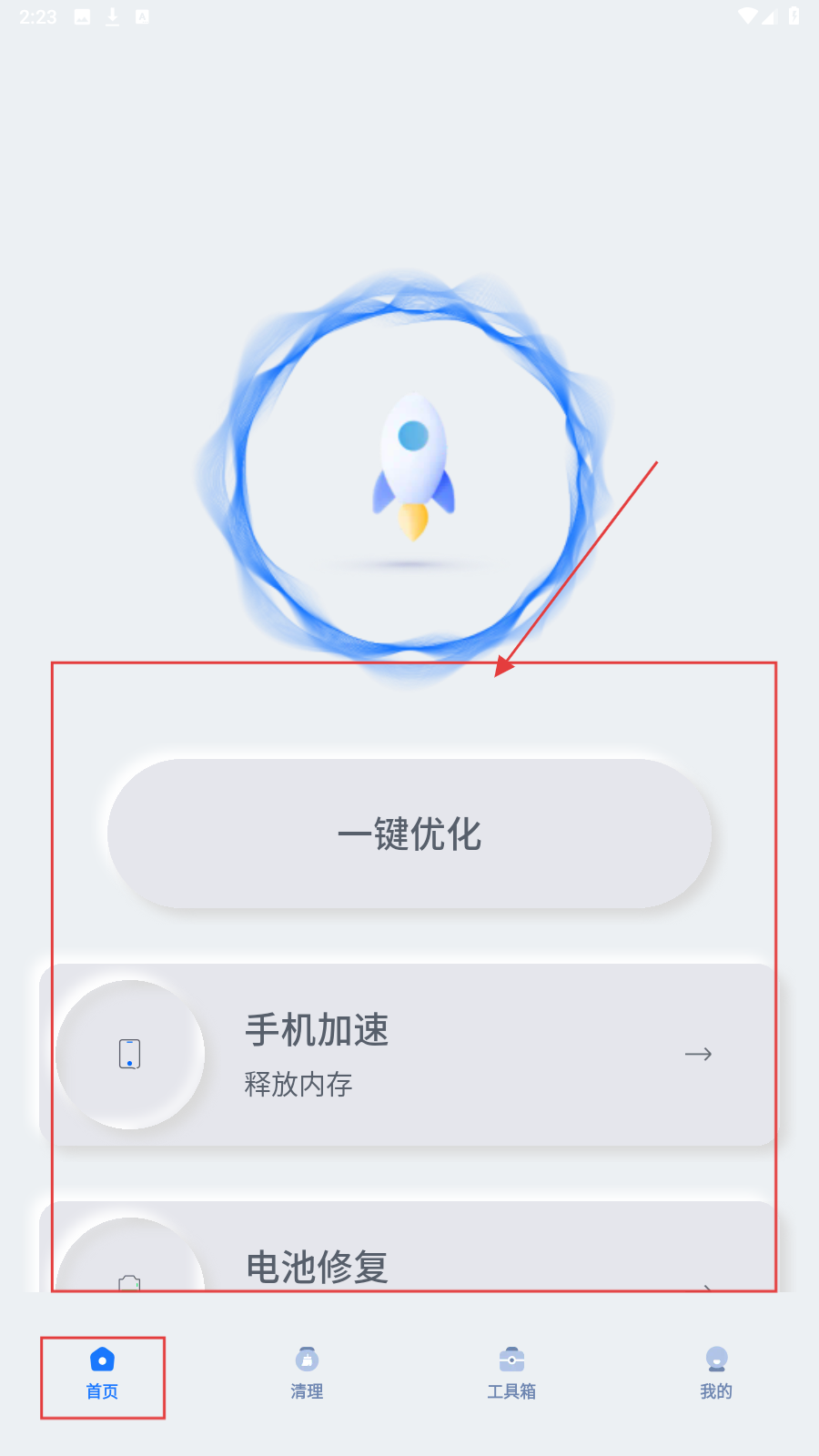 1、进入手机优化类应用【首页】,有【一键优化】【手机加速】【电池修复】等功能入口,点击对应功能使用,点【一键优化】。