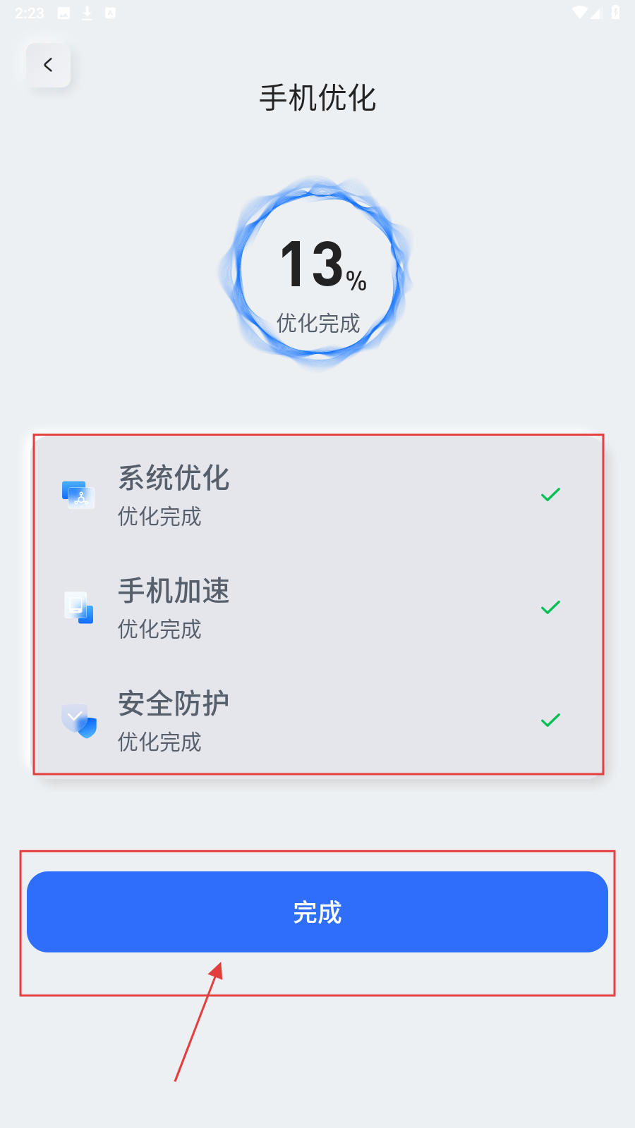 2、进入【手机优化】页,显示优化进度,包含系统优化、手机加速、安全防护等项,完成后点【完成】。
