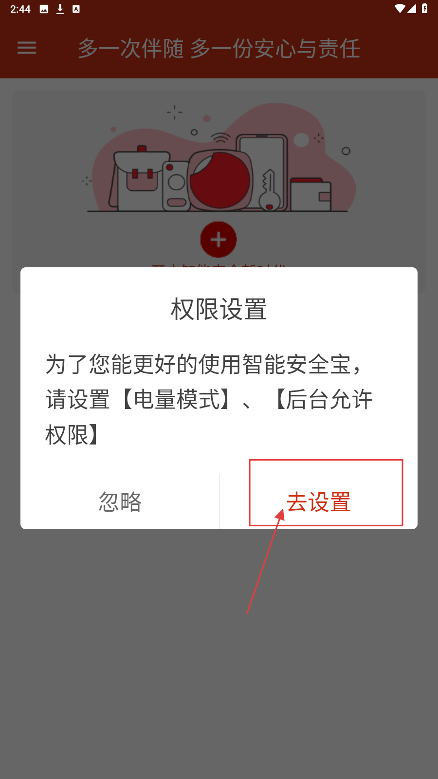1、打开智能安全宝应用,弹出【权限设置】弹窗,提示设置电量模式、后台权限,可点【去设置】或【忽略】。