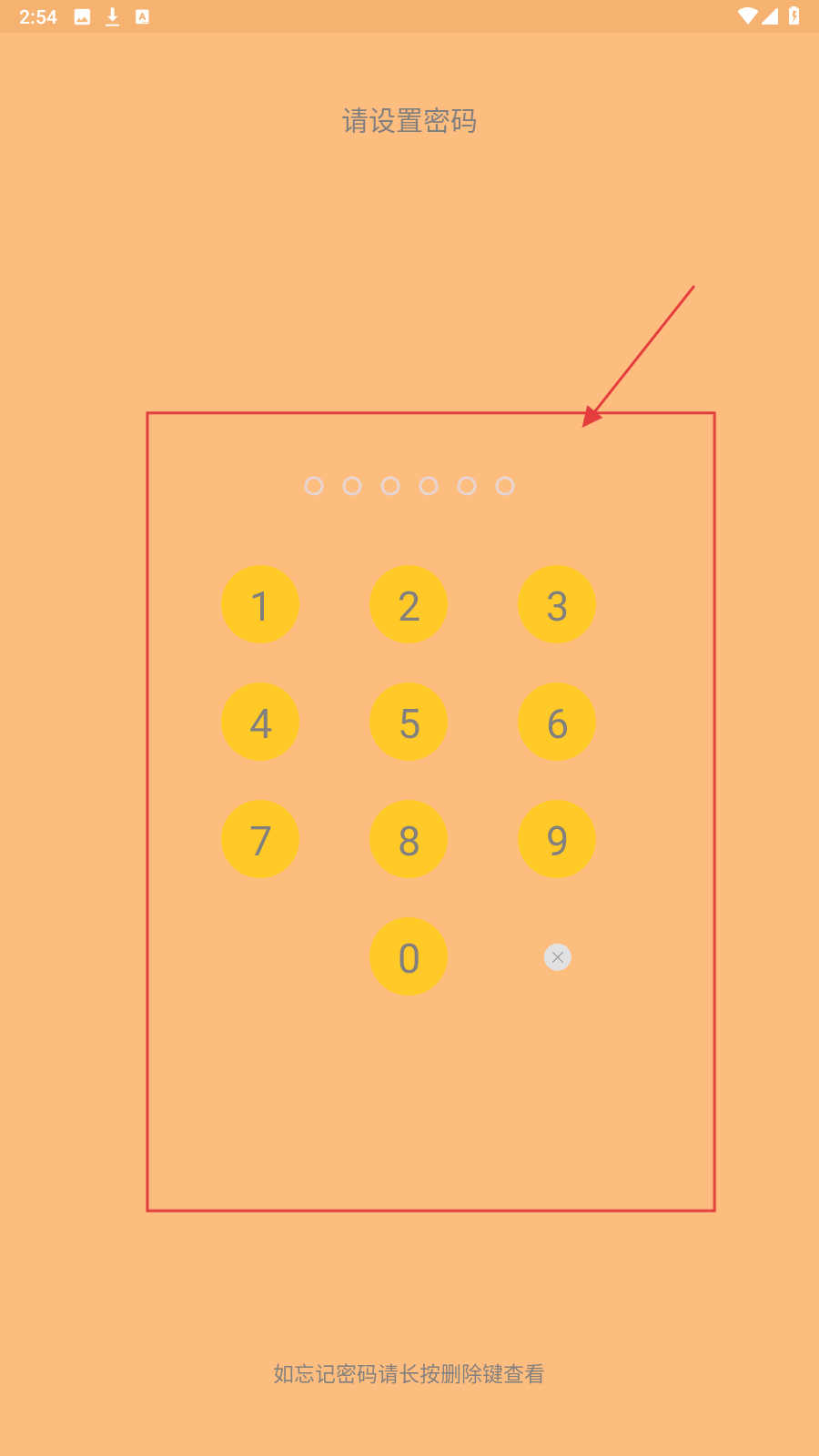 1、进入应用,先在【密码设置】页,通过数字键盘设密码(6位),忘密码可长按删除键查看。
