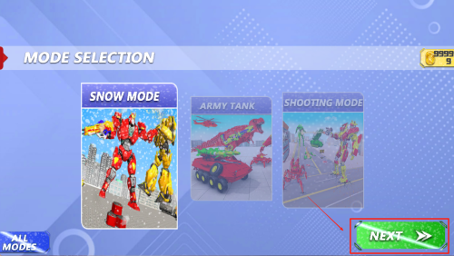 1、选择游戏模式:在模式选择界面,点击“NEXT”按钮选择一个游戏模式,如“SNOW MODE”、“ARMY TANK”或“SHOOTING MODE”。