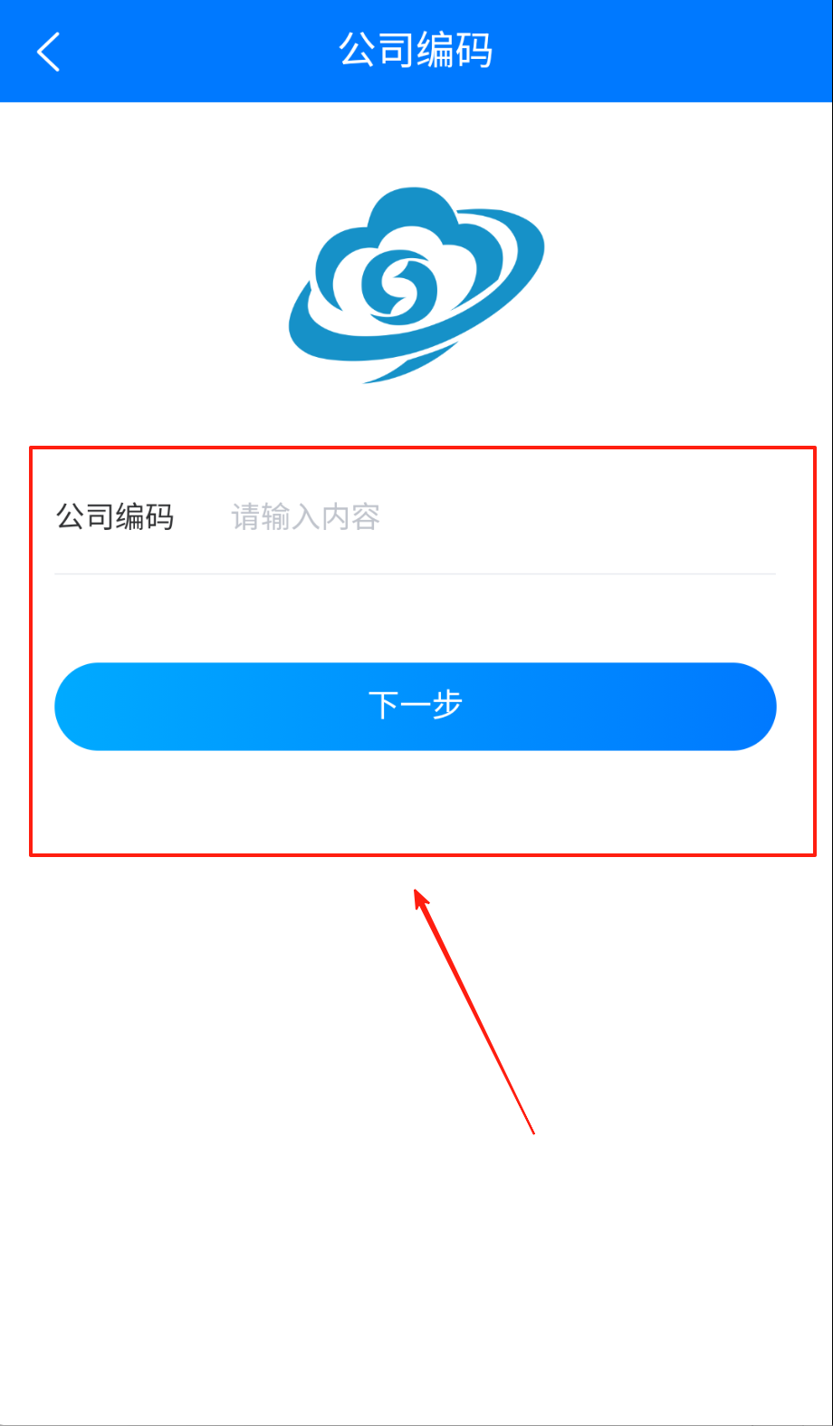 1、输入公司编码在第一个框里填准数字呀,顶部蓝条写着公司编码别找错位置,输完点蓝色下一步按钮继续流程哦。