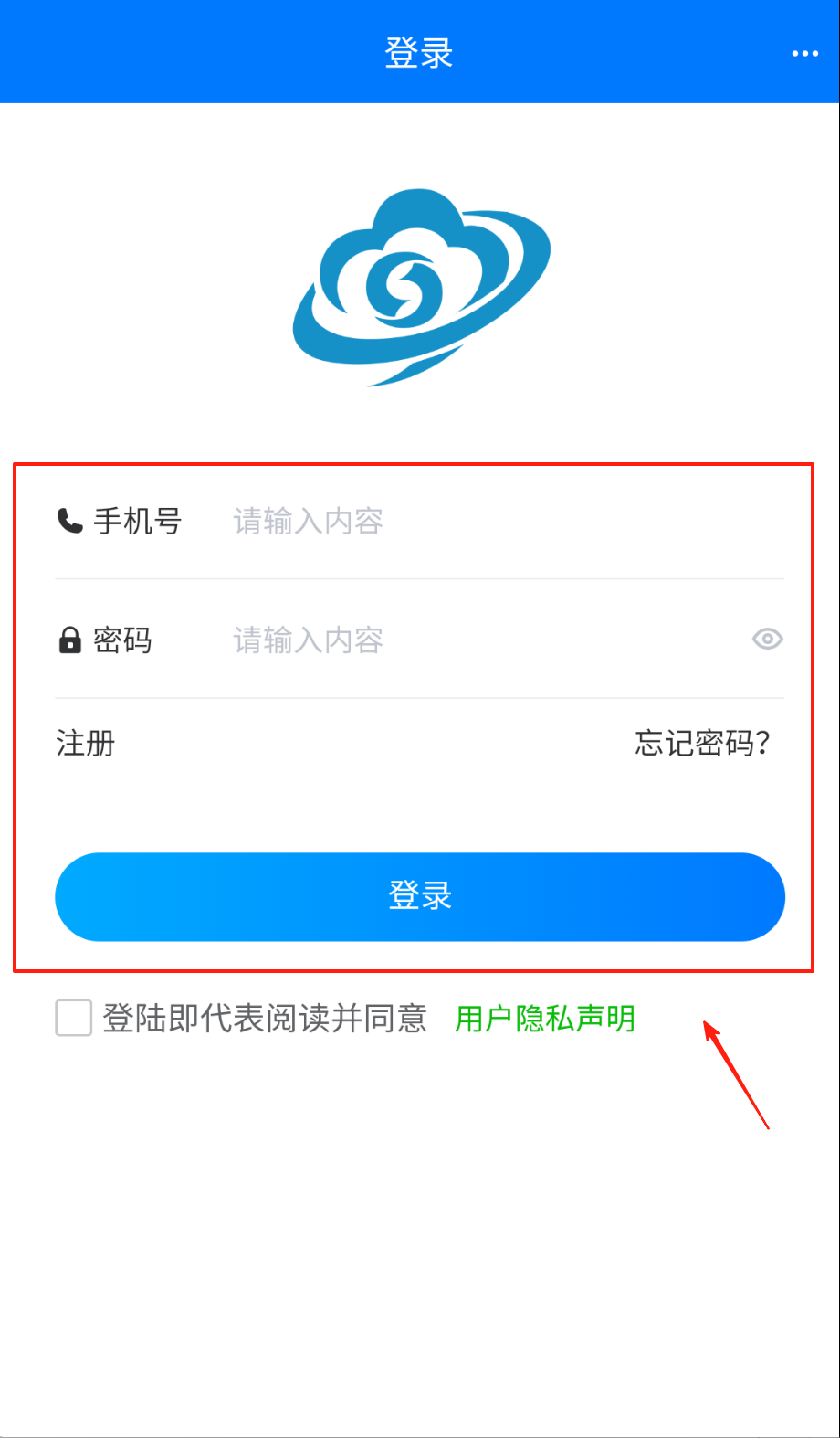 3、登录页填手机号到上框密码进下框,关键操作勾选同意隐私条款小框,点灰色登录按钮完成进系统呀。
