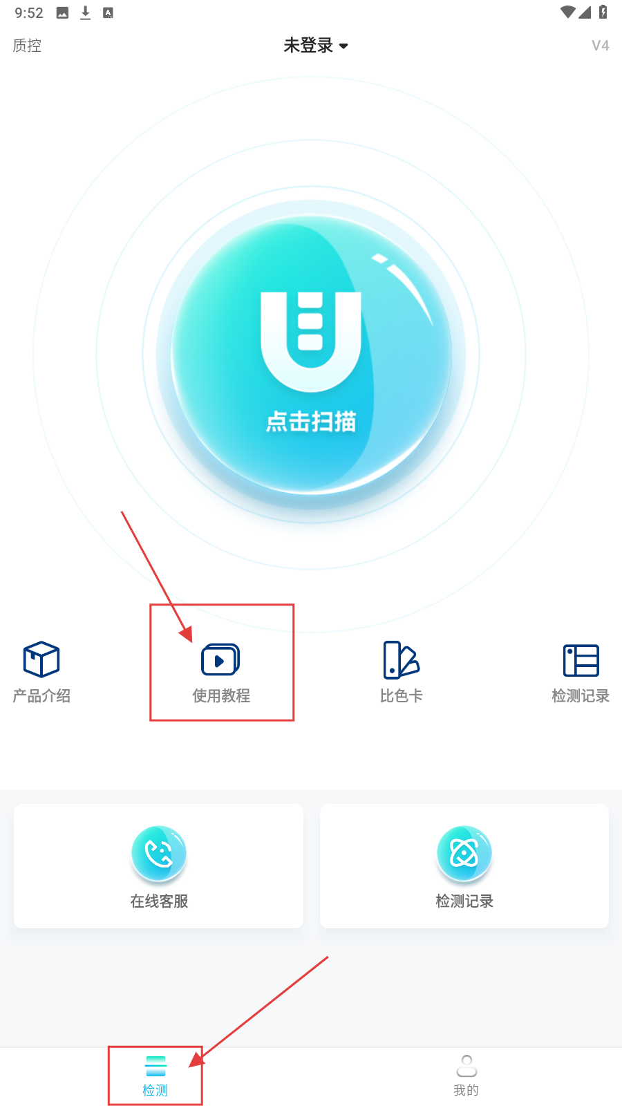 2、进入【检测】页,有【点击扫描】按钮,及产品介绍、使用教程等功能,点击【使用教程】【检测】操作。