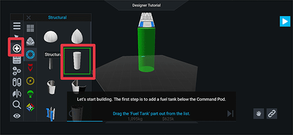 2、在【DesignerTutorial】环节中,通过点击【+】号,从列表中拖动【FuelTank】部件至【CommandPod】下方,开始搭建航天器。