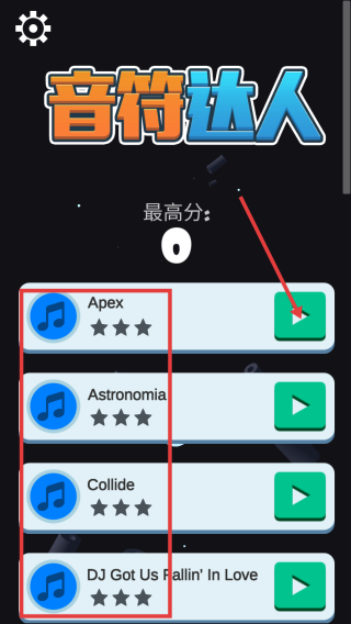 1、在歌曲选择界面,可点击歌曲(如【Apex】)右侧的绿色播放按钮开始游戏,依据喜好和难度选择歌曲。