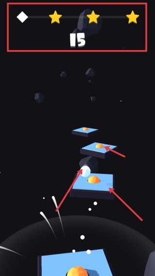 2、游戏进行中,操控白色小球准确落在带有橙色音符的平台上,获取分数,同时留意上方星级目标,争取获得更多星星。