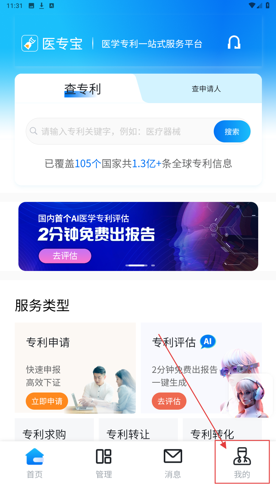 1、打开医专宝APP,进入首页,有【查专利】【查申请人】功能,还有专利搜索框、服务类型,点击【我的】进入登录页。