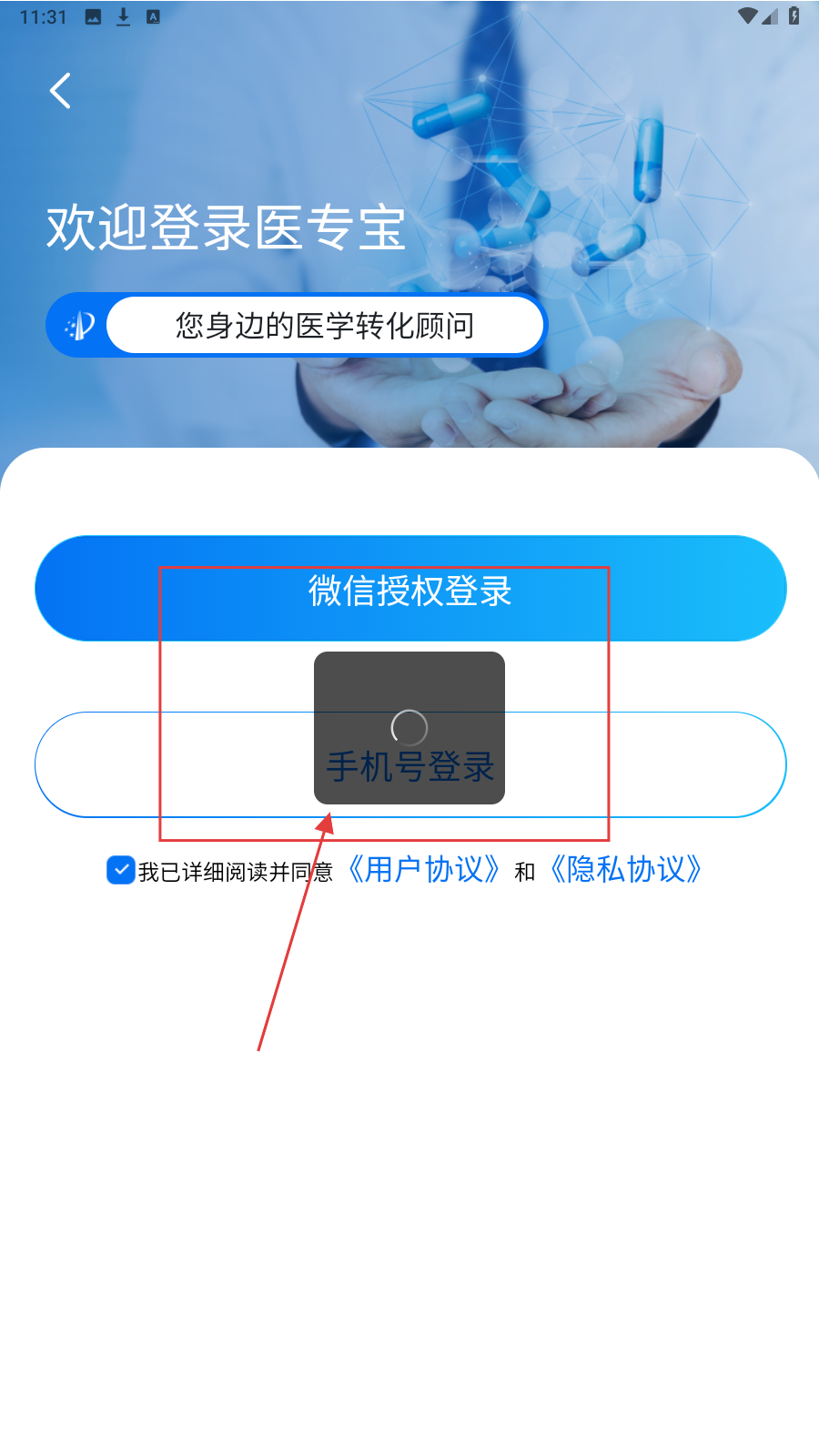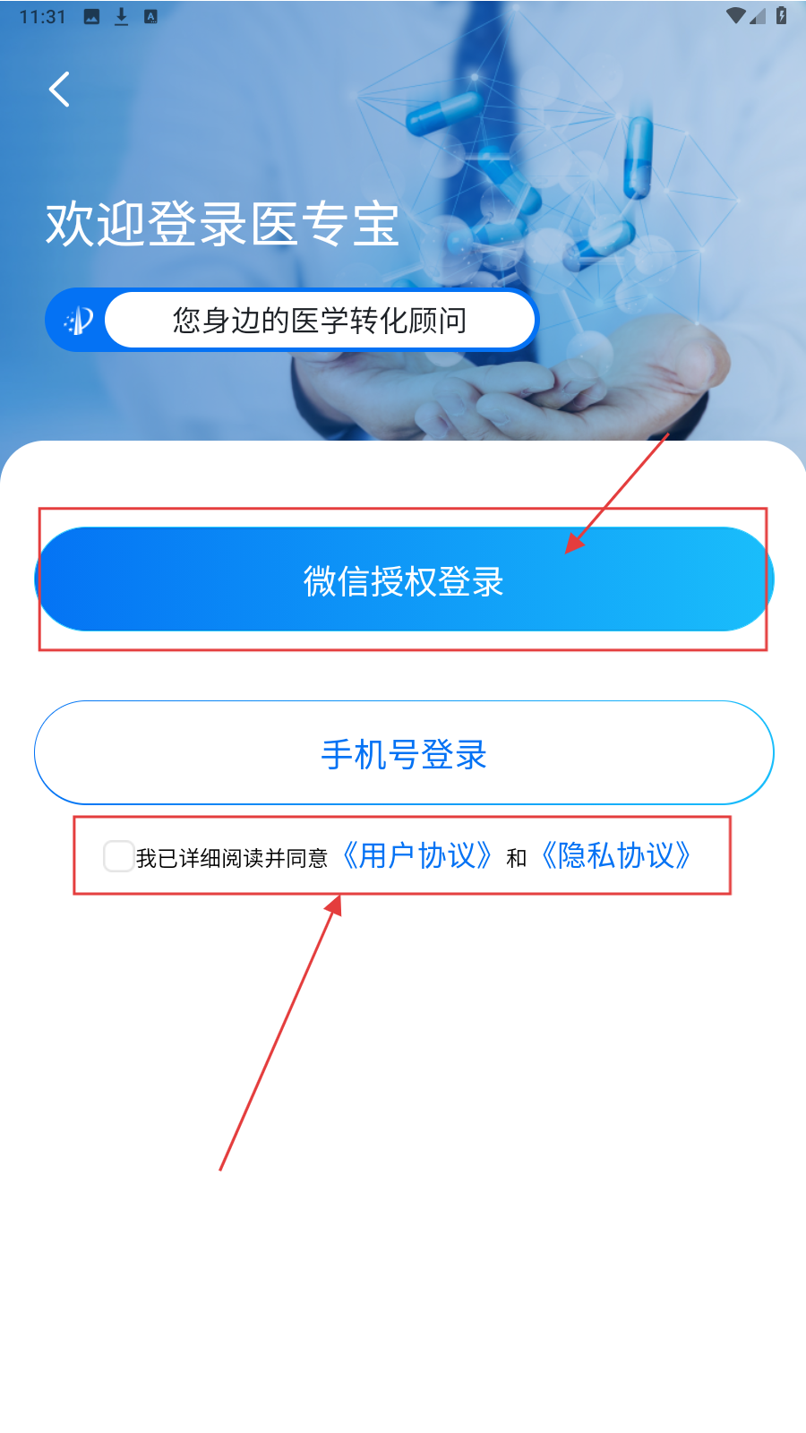 2、在登录页,有【微信授权登录】【手机号登录】选项,需勾选【我已详细阅读并同意《用户协议》和《隐私协议》】,再选登录方式。