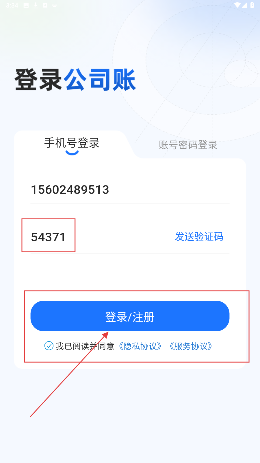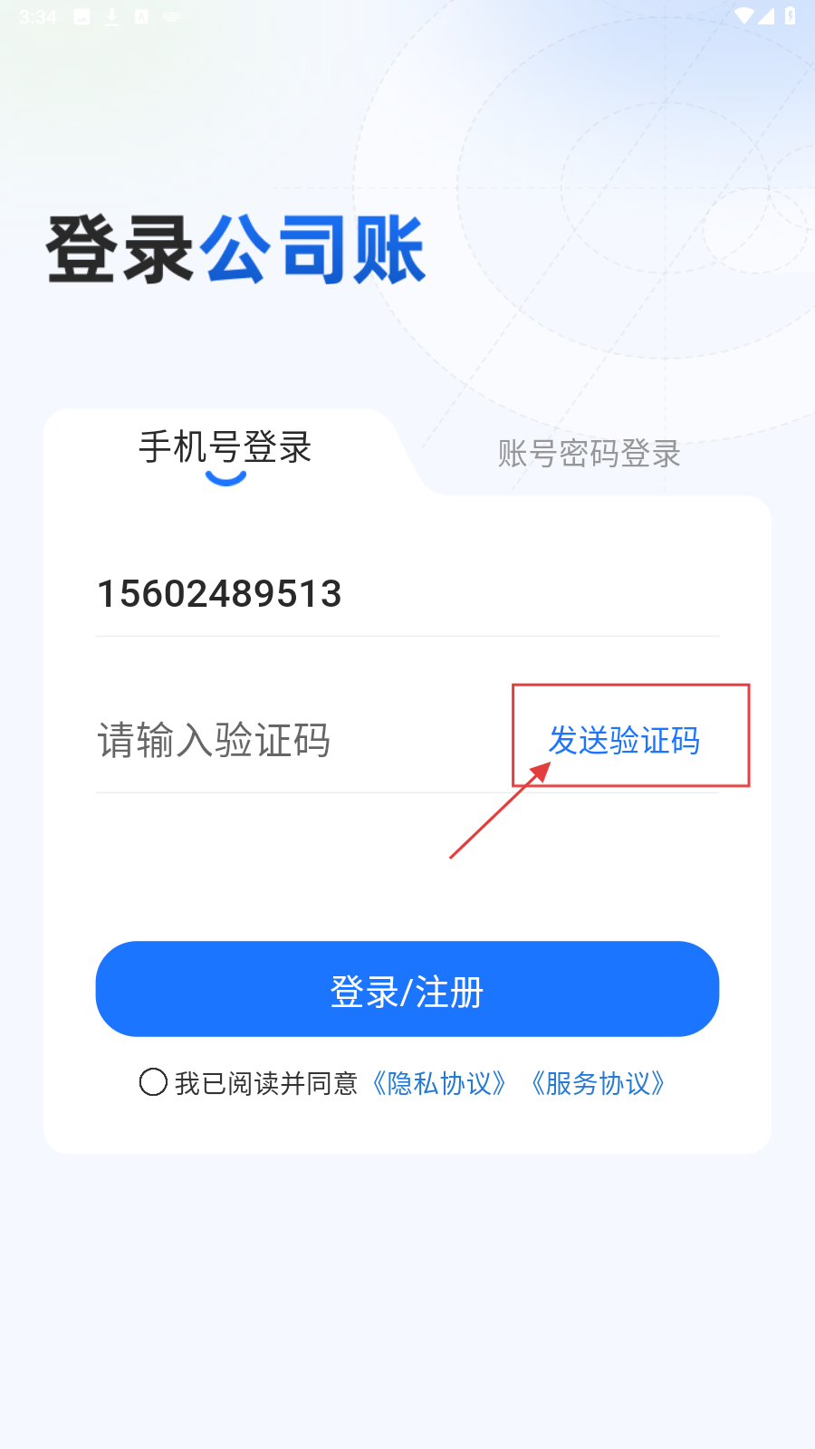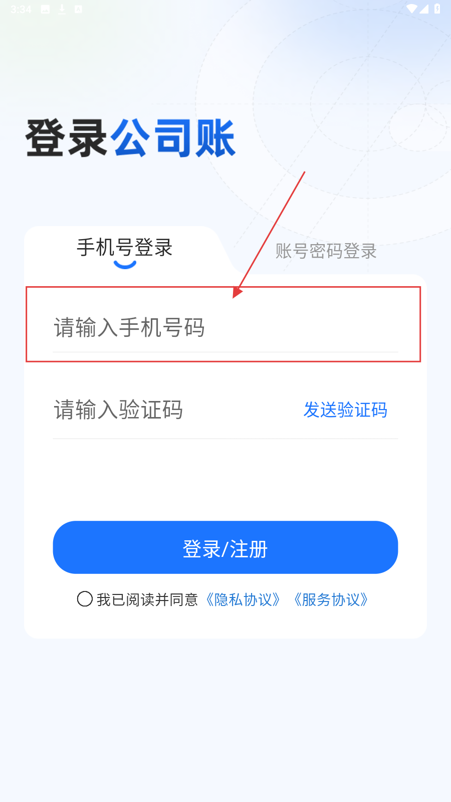 1、在“登录公司账”页面,选【手机号登录】,填手机号。