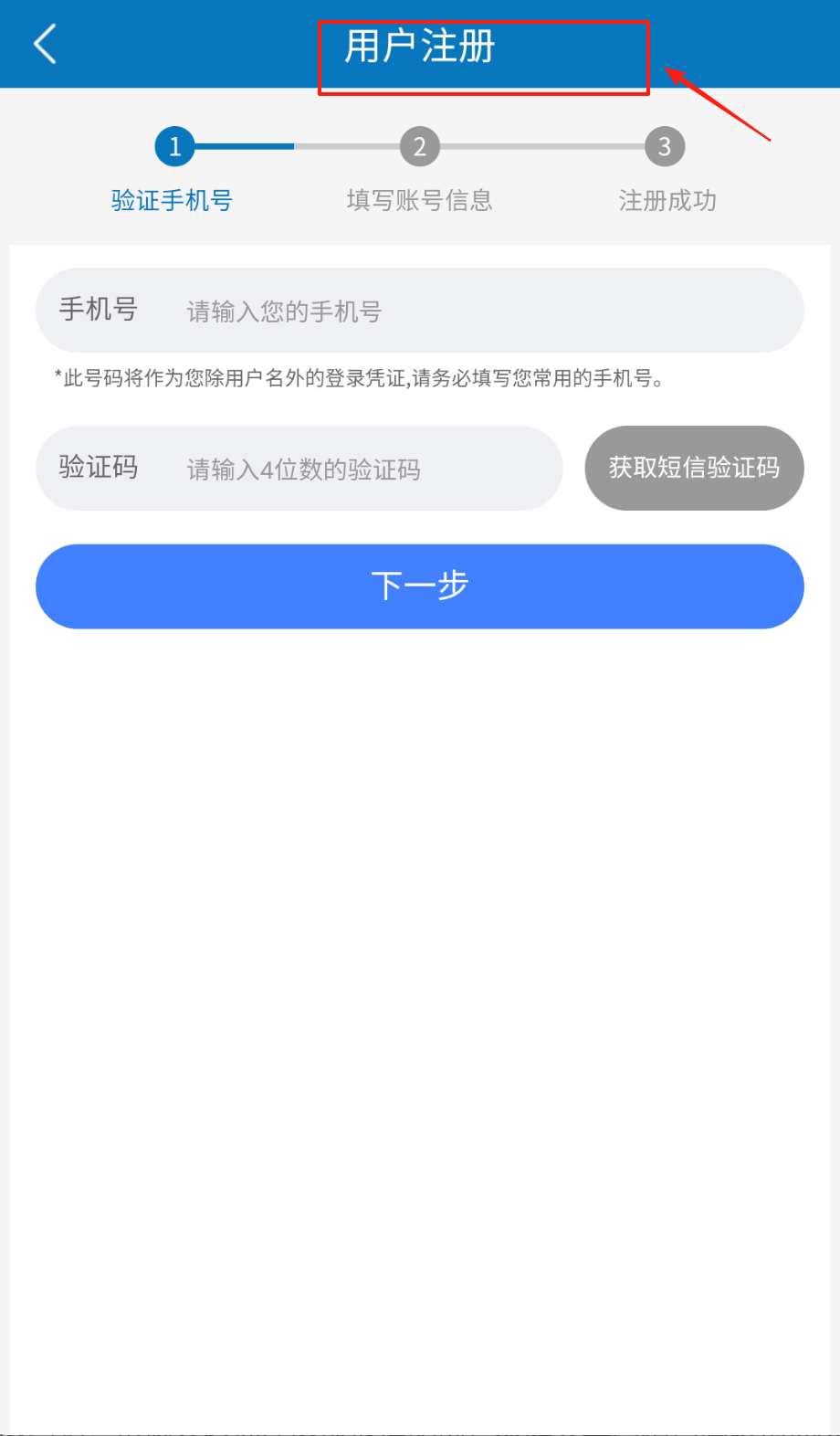 1、注册先输常用手机号别错数呀,点蓝底"获取短信验证码"钮收四位数验证码,填完点灰底"下一步"键进下环节哦。