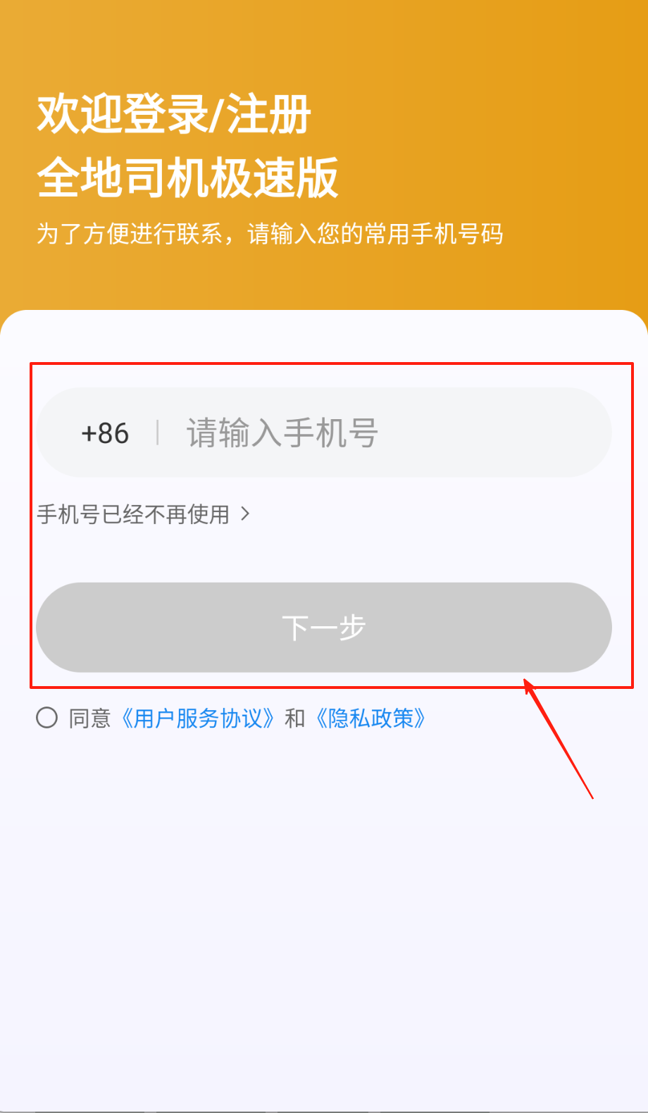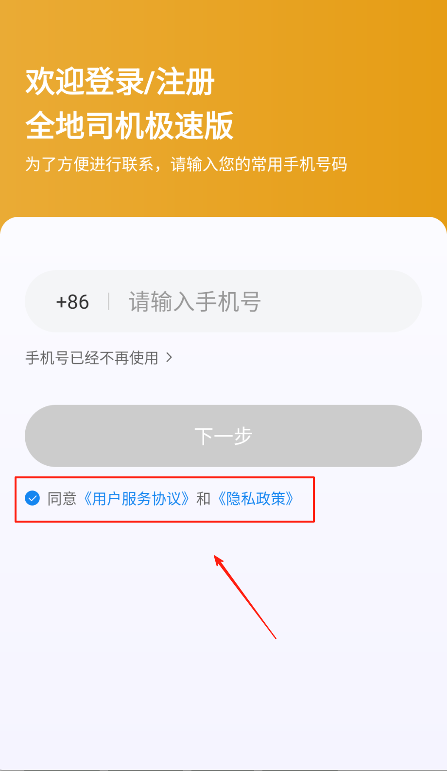 3、返回登录页输当前在用手机号,勾同意服务与隐私协议框,点灰下一步键变亮就能继续咯。