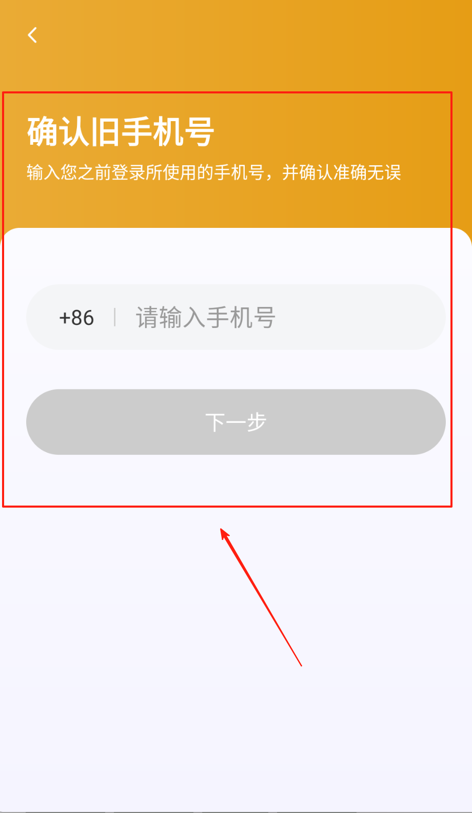 1、打开橙底确认旧手机号界面呀,在+86后白色填号框输入常用号码别错数,点灰底"下一步"按钮提交哦。