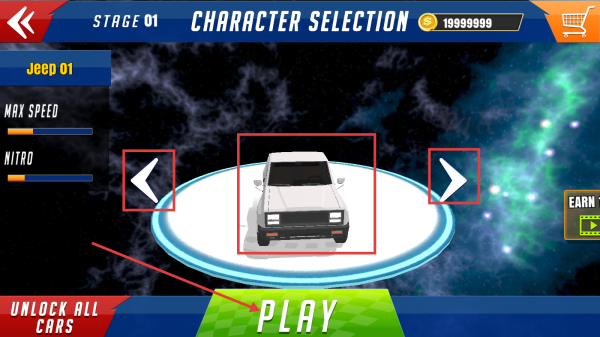 1、在“CHARACTERSELECTION”界面,可通过左右箭头切换车辆,查看不同车辆的属性,选择适合的车辆后进入游戏。