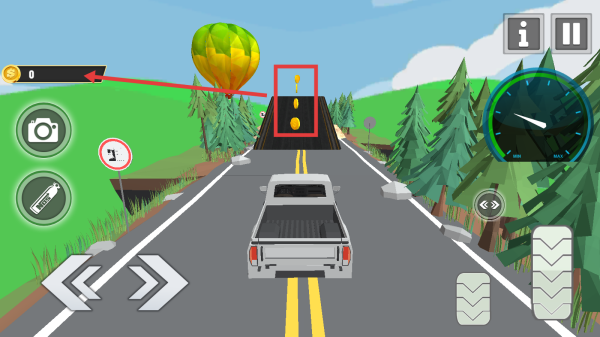 3、在驾驶过程中,留意赛道上的金币(如空中悬浮的金币),及时收集可增加游戏内货币,用于后续解锁车辆或购买道具,助力游戏进程。