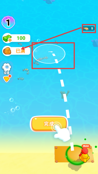 2、留意屏幕上方资源提示,像“金币+100”“鱼5”等,在移动过程中收集资源,满足“0/5”这类任务需求,填满资源进度(如“已满”)。